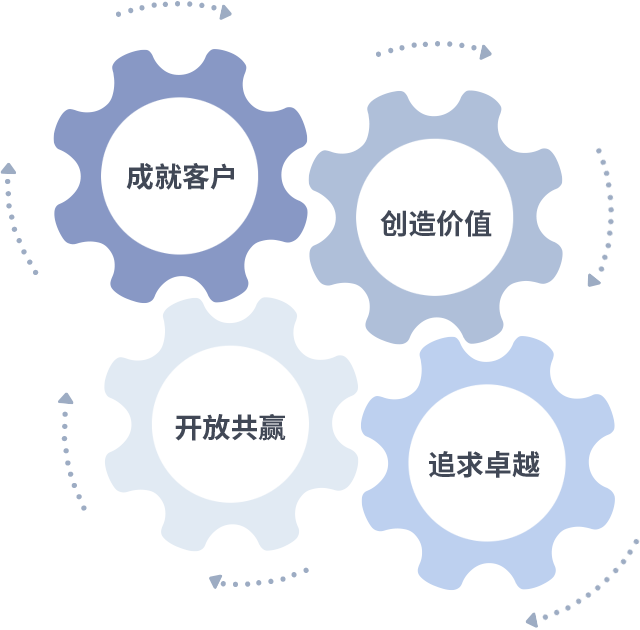 成就客户是一切决策的出发点,,创造价值是衡量所有工作的标准,,,,追求卓越是我们做事做人的态度,,开放共赢是我们的格局也是最终的结果。。。价值观的齿轮环环相扣,,,推动着组织里的每个人不断向前。。。。